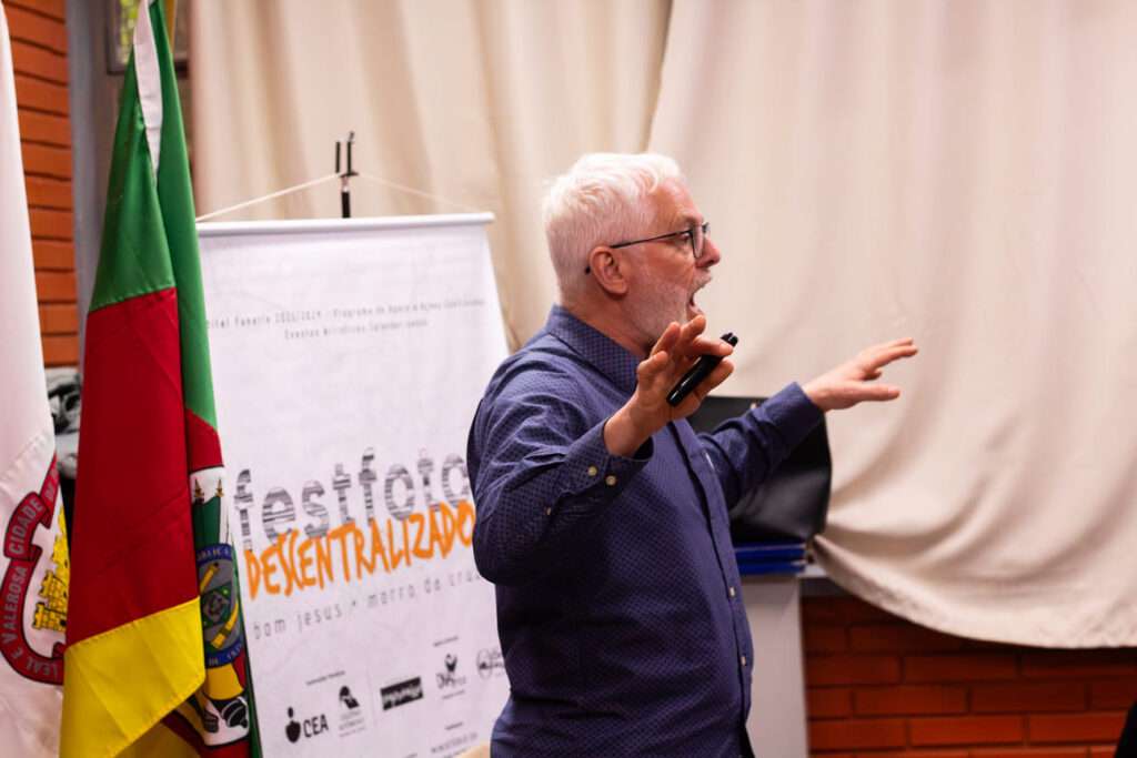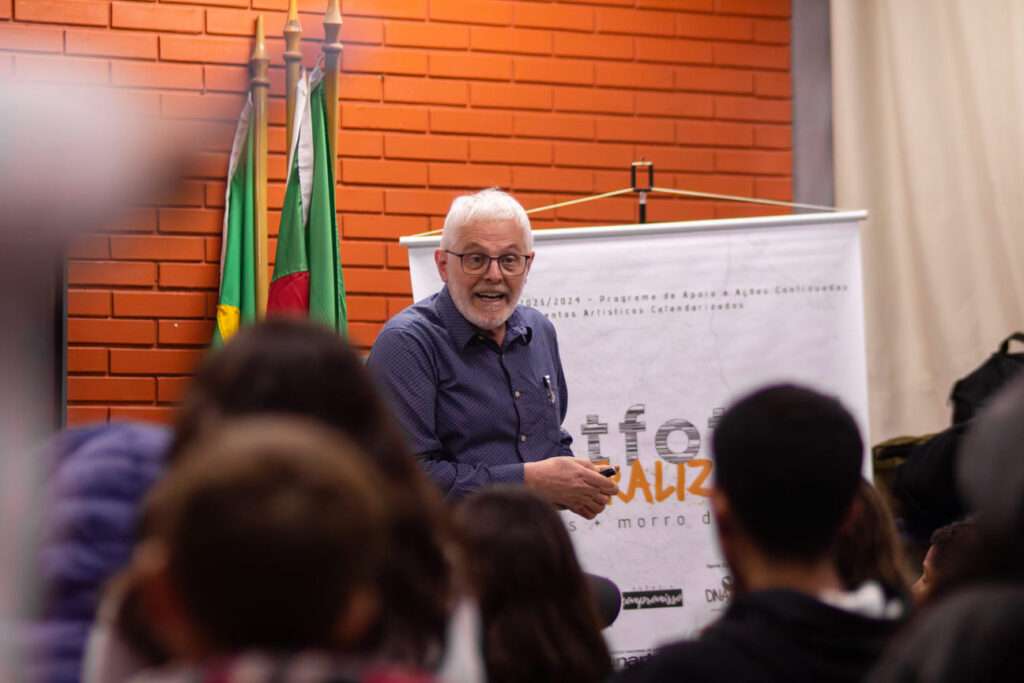 O professor, geólogo e coordenador-geral do Atlas Ambiental de Porto Alegre, Rualdo Menegat iniciou a palestra “O lugar onde vivemos: conhecendo a paisagem de Porto Alegre e Morro da Cruz” explicando o processo de formação de Porto Alegre e dos morros que compõem a cidade. Ele destacou que cada morro tem uma história própria, resultado de diferentes formações geológicas.