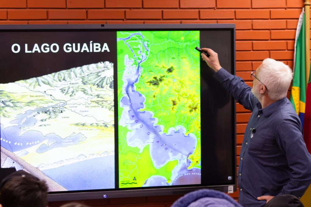 Porto Alegre é um lugar onde diferentes tipos de paisagens se encontram. A conclusão é da palestra do geólogo Rualdo Menegat, na Escola Municipal de Ensino Fundamental Morro da Cruz, em 8 de setembro. A atividade é uma etapa preparatória à saída de campo que faz parte da oficina de fotografia do FestFoto Descentralizado Morro da Cruz.